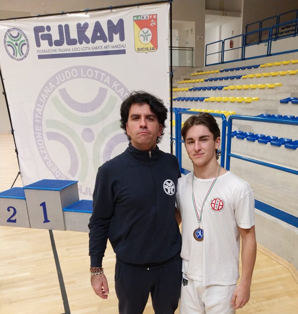 Alberto Faraone ha partecipato con successo, per la Ryoku Karate Palermo, alla fase regionale della qualificazione per i Campionati Nazionali di Karate Juniores, in programma dal 21 al 23 di novembre, svoltisi in data 02 Novembre 2025 al Palasport di Caltagirone. Alla competizione, l’atleta della ASD Ryoku Karate-Do Shito Ryu, ha ottenuto il terzo posto nella specialità del Kumite, categoria Juniores Kg. -76. L’atleta è stato accompagnato dal Direttore Tecnico Ist. Marco Siino in occasione della trasferta. Nella foto, l’atleta Alberto Faraone con il Tecnico Marco Siino.